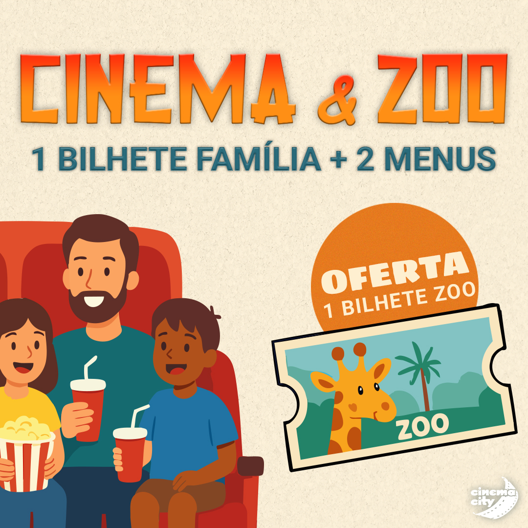No Cinema City, a partir de 20/11/2025, na compra de 1 Bilhete Família + 2 Menus Pipocas* = oferta de 1 bilhete para o Jardim Zoológico de Lisboa, no valor de 30,50€
