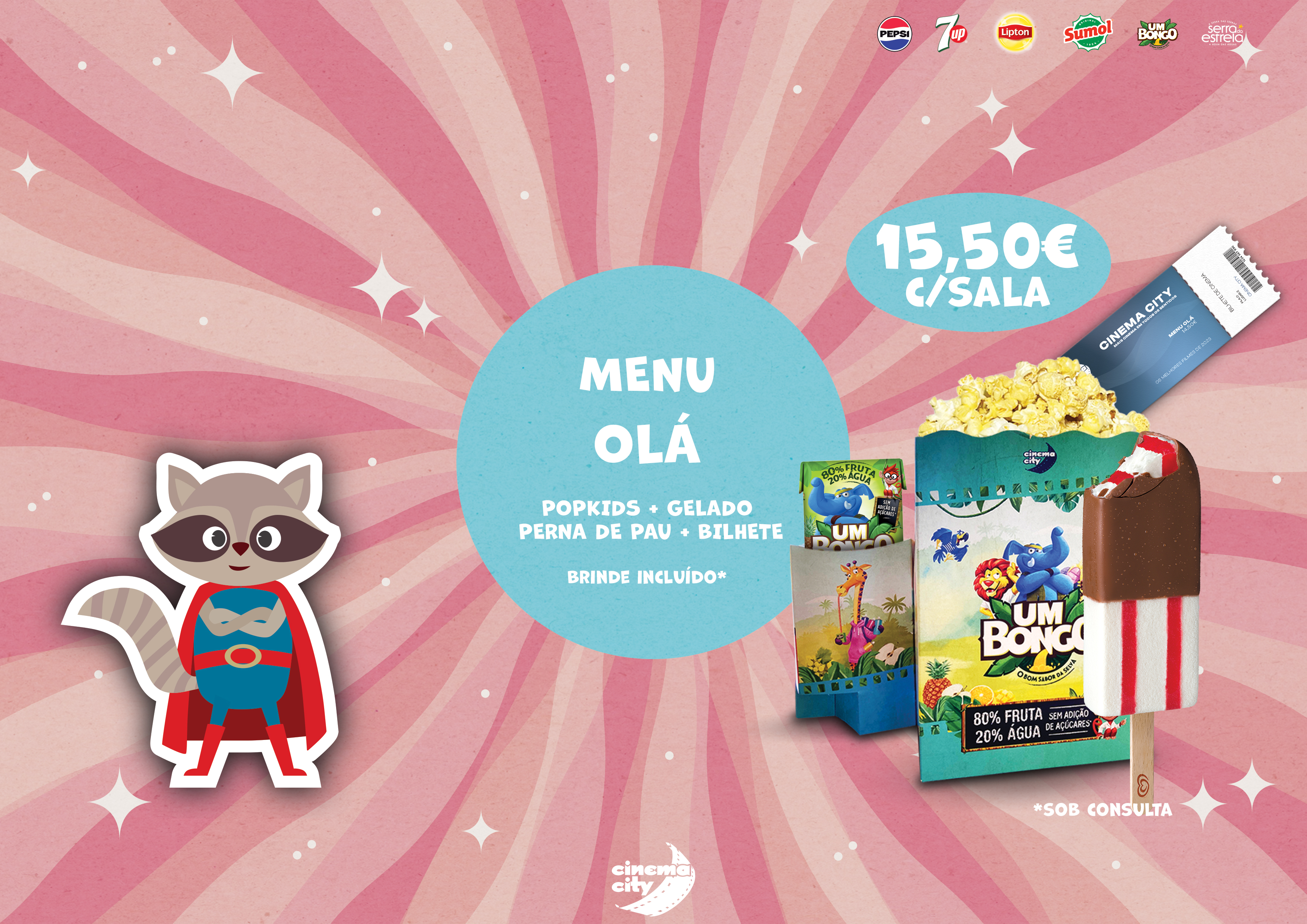 Bilhete normal 2D + Popkids (pipoca + refrigerante 0,30 l** ou Um Bongo ou água 0,33 l + Brinde) + Perna de Pau: 15,50€*
