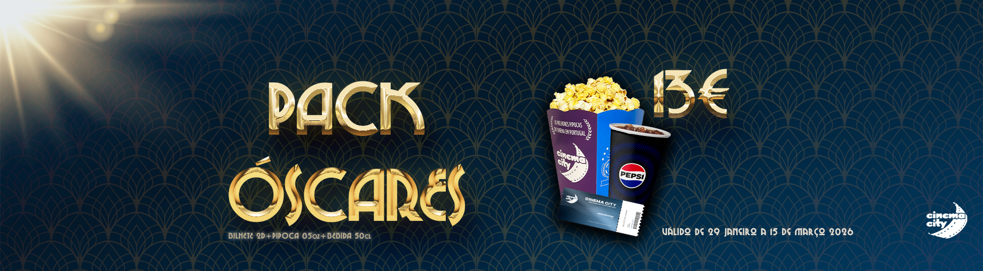 O PACK ÓSCARS tem um bilhete de cinema (normal, 2D), 1 balde de pipocas pequeno (85 oz) e 1 bebida média (50 cl). Tudo, por apenas 13€.